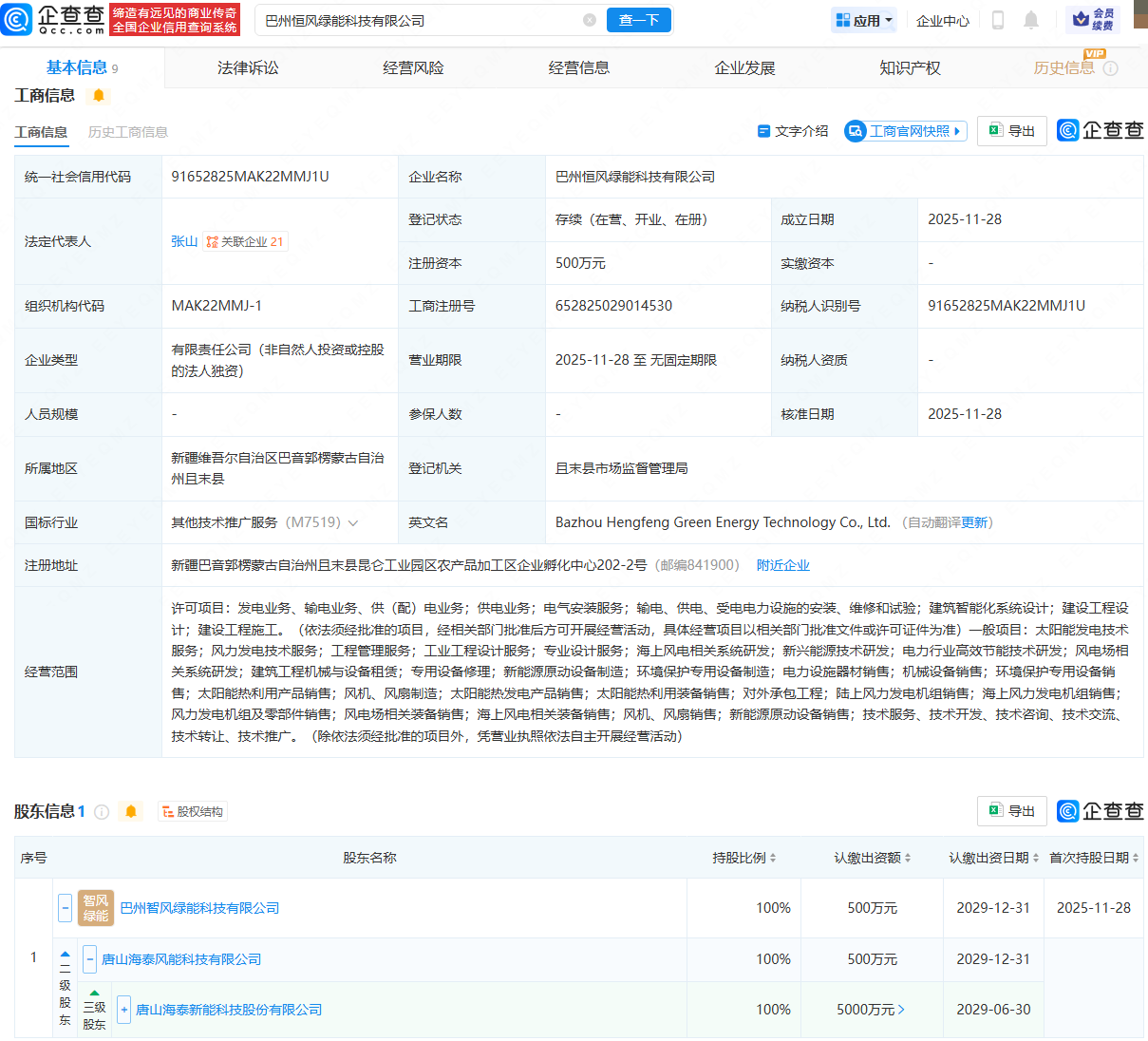 近日,巴州智风绿能科技有限公司、巴州恒风绿能科技有限公司成立,法定代表人均为张山犀牛配资,经营范围均包含:发电业务、输电业务、供(配)电业务;供电业务;太阳能发电技术服务;风力发电技术服务等。企查查股权穿透显示,两公司均由海泰新能(920985)间接全资持股。