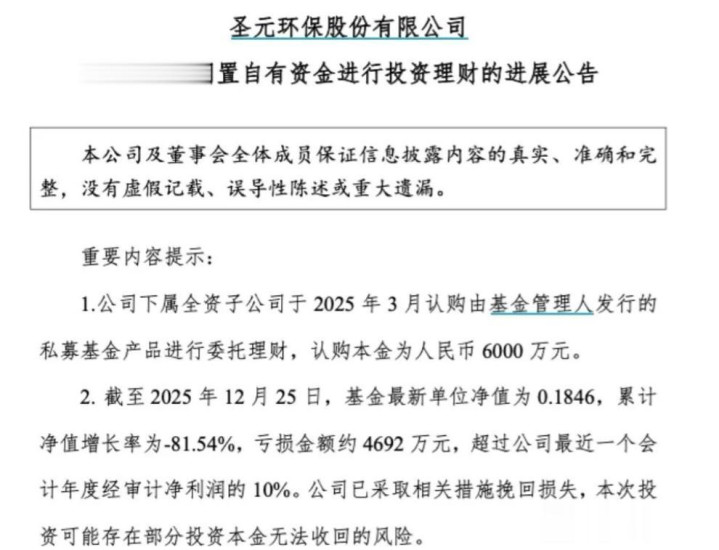 从2025年3月认购到12月25日,基金单位净值跌至0.1846元,累计亏损幅度达81.54%,亏损金额约4692万元,已超过公司最近一个会计年度经审计净利润的10%。